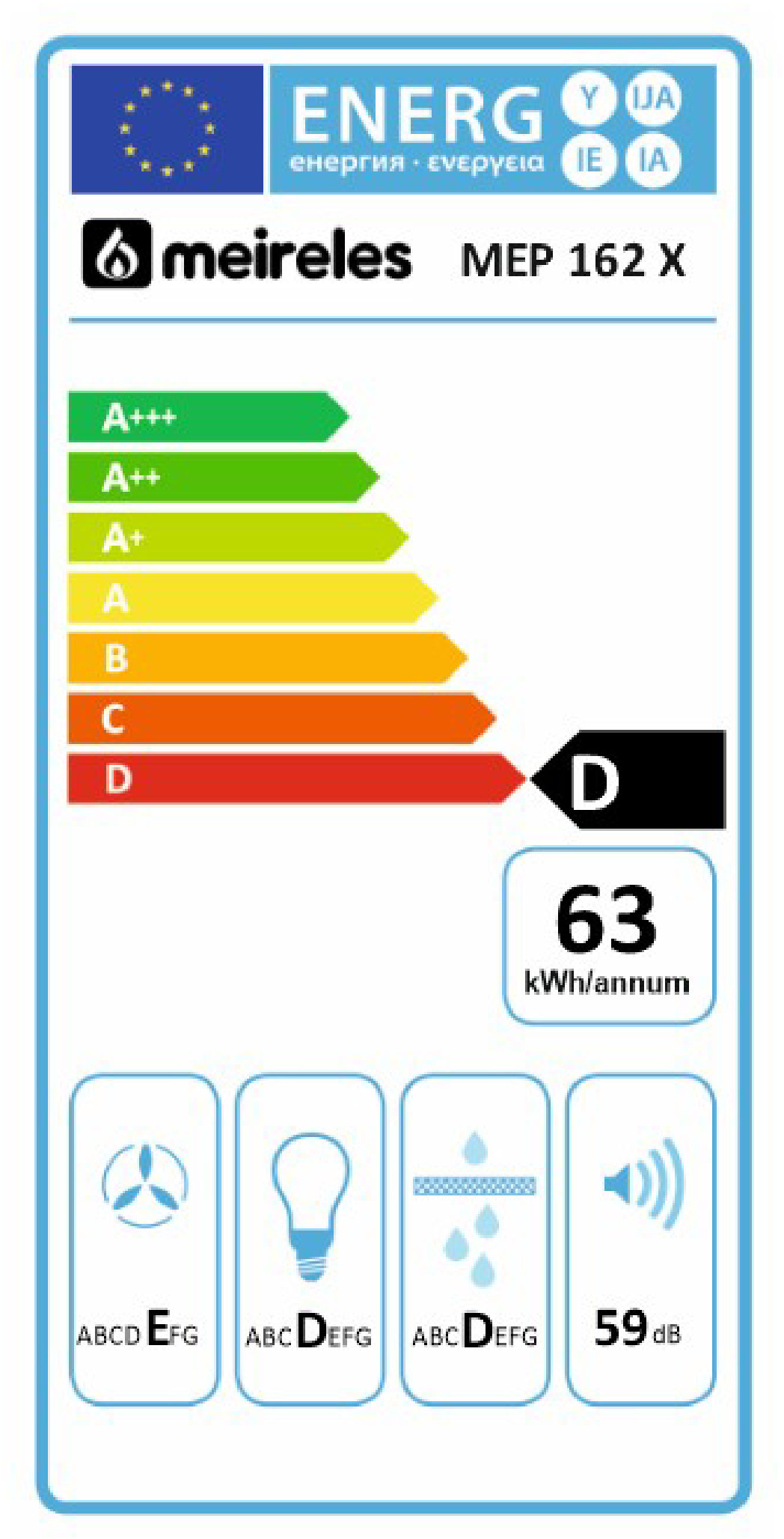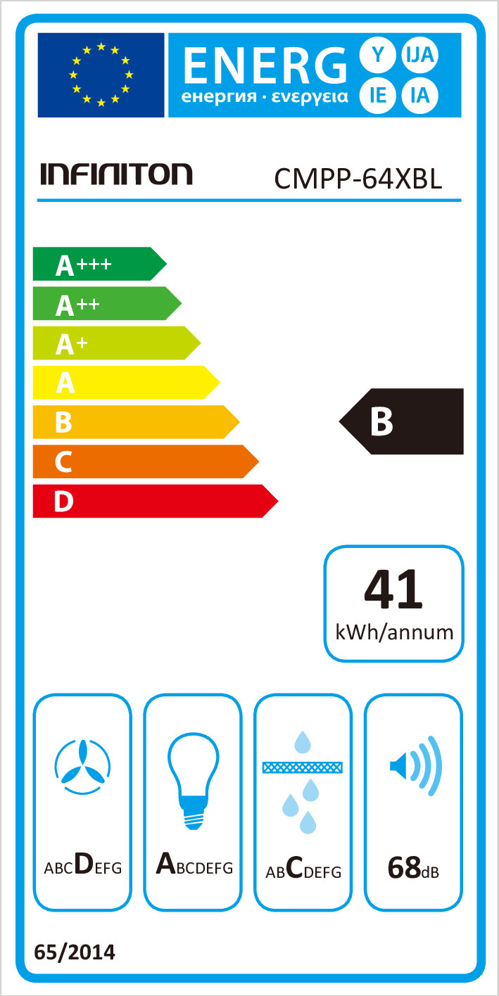 Aspiração/Extracção: 410 m3/hora / Ef. fluído dinâmica: D / Ef. iluminação: A